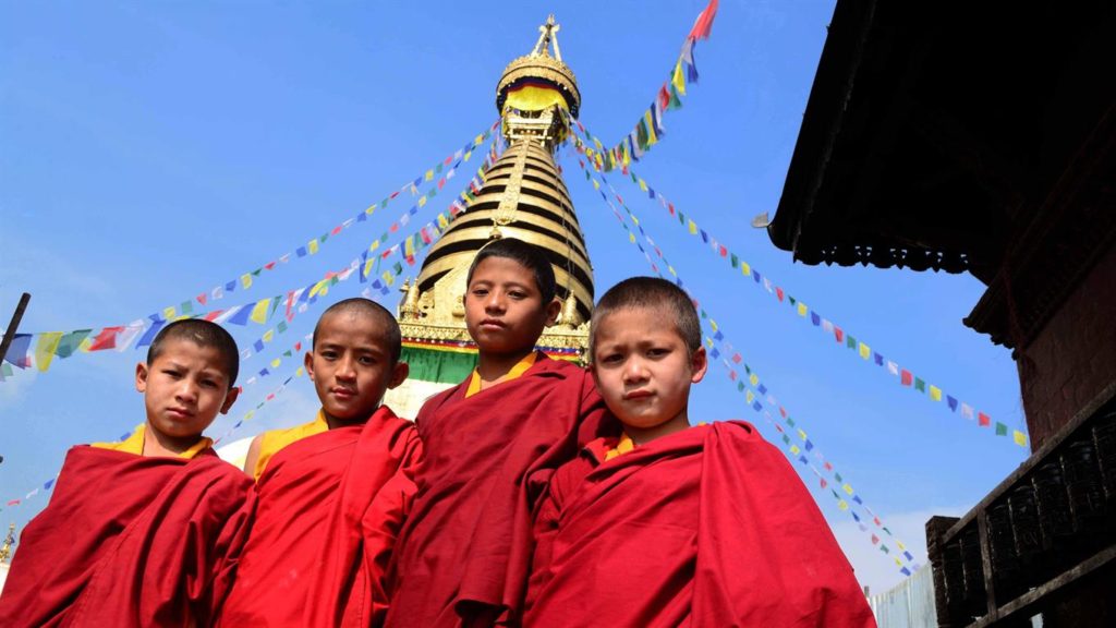 Algo más cerca del centro de Katmandú, el templo de Swayambhu es también un sitio de enorme importancia para el budismo. Su estupa esférica se ubica sobre una alta colina a la que se accede luego de subir casi cuatrocientos escalones. El lento y fatigoso ascenso debe hacerse siempre rodeado de monos, que corren y saltan de a cientos por las escaleras. «Son tantos que ahora a Swayambhu se lo conoce como el Templo de los Monos. Nadie le dice ya por su nombre real», cuenta Hari, joven de unos 20 años que asegura además que desde la cima de la colina las vistas de Katmandú son incomparables. Una vez arriba, las increíbles panorámicas de la ciudad le dan la razón. Allí abajo, a los pies del templo budista, se pueden ver los tejados rojos de Durbar, las aguas del Bagmati y unas cuantas estupas de techos esféricos.